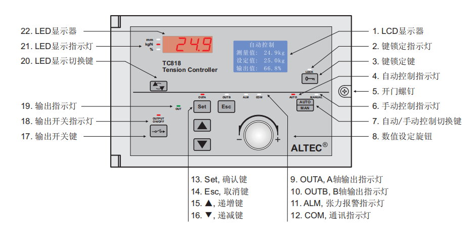 - 當控制器工作在自動控制模式時,自動控制指示燈AUTO)點亮,可旋轉(zhuǎn)數(shù)值設(shè)定旋鈕或按遞增鍵/遞減鍵修改張力設(shè)定值,按AUTO/MAN鍵可切換到手動控制模式。