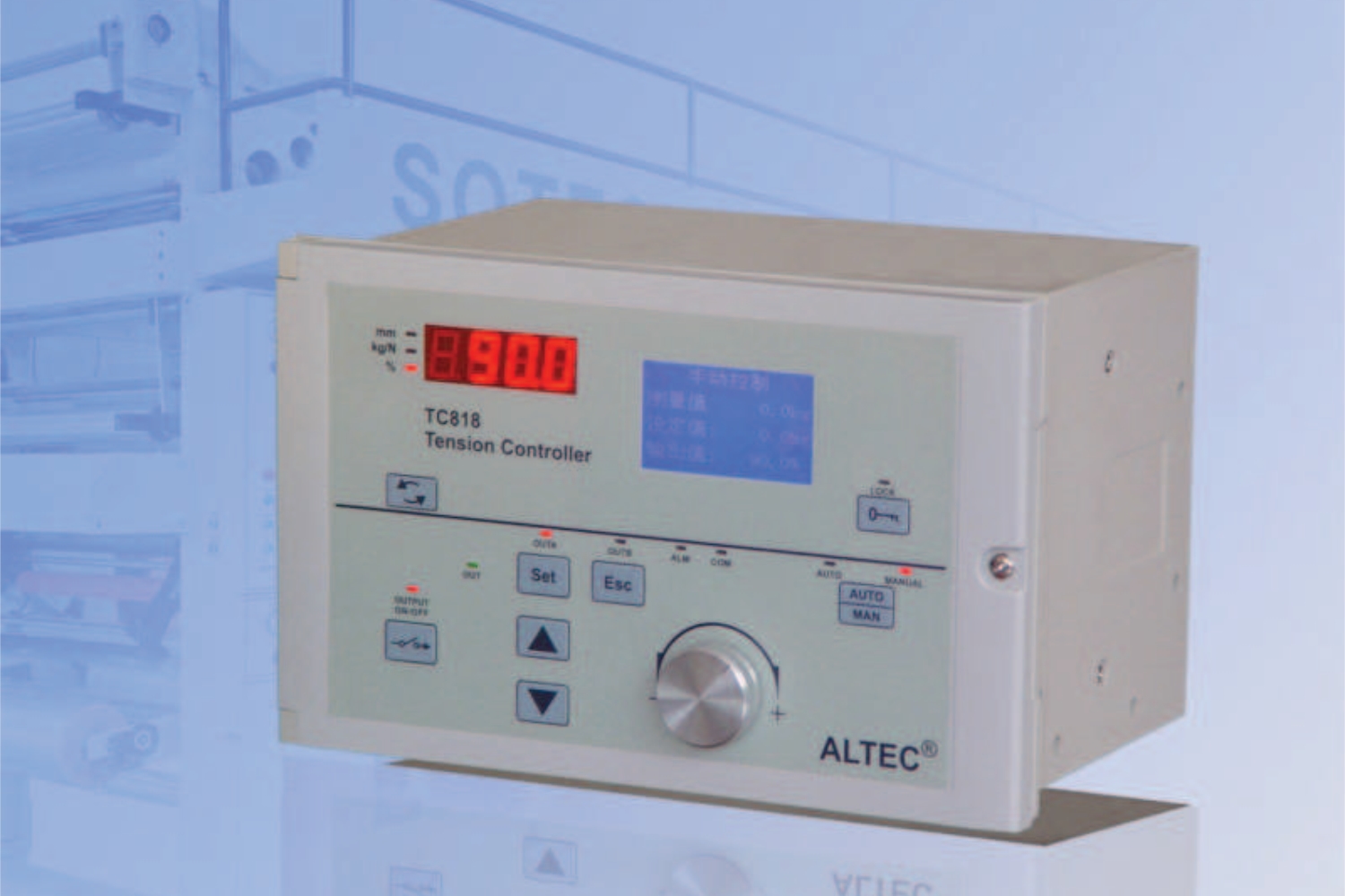 TC818張力控制器采用圖形液晶顯示器,可選擇中、英文顯示,界面友好易用,可輸出0~24V/4A或0~36V/3A直接驅(qū)動磁粉離合器,磁粉制動器,也可以輸出0~5V,4-20mA,-5V~+5V信號,控制變頻器,伺服電機或其它執(zhí)行機構(gòu),對卷料系統(tǒng)進行高精度的張力控制。可廣泛應(yīng)用于造紙、印刷、包裝、紡織印染等行業(yè)。