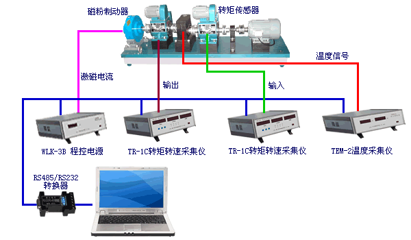 - 傳動機械測量系統(tǒng)通過2臺相位差式轉(zhuǎn)矩轉(zhuǎn)速傳感器及2臺TR-1C轉(zhuǎn)矩轉(zhuǎn)速采集儀采集變速箱的輸入(輸出)轉(zhuǎn)矩和轉(zhuǎn)速;用1臺TEM-2溫度采集儀采集溫升;用WLK-3B程控電源控制磁粉制動器對變速箱進行加載。