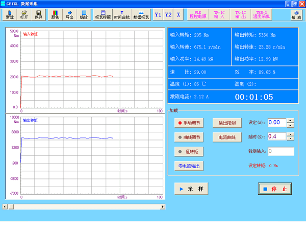 傳動機械測量系統(tǒng)采用磁粉制動器對減速機(擺線針輪減速機、蝸輪減速機、行星齒輪減速機等)加載,采用相位差式轉(zhuǎn)矩轉(zhuǎn)速傳感器對變速箱(減速機)進行扭矩測量、轉(zhuǎn)速測量、功率測量、機械效率測量、速比計算;采用數(shù)字溫度傳感器進行溫度測量。根據(jù)用戶要求設計減速機測試軟件,輸出減速機測試報表。該系統(tǒng)可以進行空載試驗、滿載試驗、效率試驗、溫升試驗。