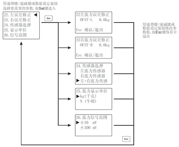 當(dāng)測量值發(fā)生零點偏移時,如偏移誤差較小,可以對傳感器誤差進(jìn)行修正,通過修正可以校正零點,所設(shè)置的修正值將加到張力顯示值中,如偏移誤差較大,應(yīng)對控制器進(jìn)行重新標(biāo)定。
