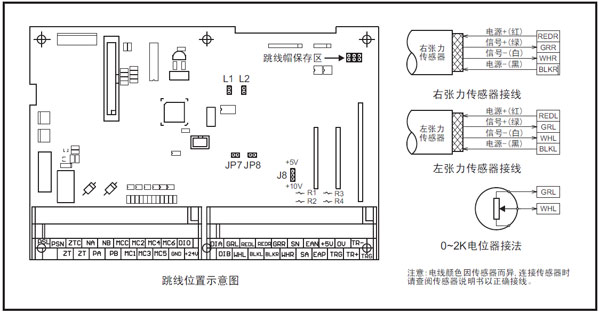 [3]在浮輥式張力系統(tǒng)中,當(dāng)選用的角度傳感器為0~2KΩ點位器時,請將控制板上的跳線L1短接(為點位器提供恒流源),JP7,JP8短接。