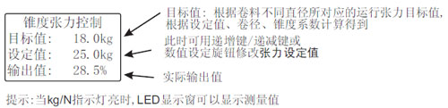 當(dāng)控制器工作在自動控制模式時,自動控制指示燈(AUTO)點亮,可旋轉(zhuǎn)數(shù)值設(shè)定旋鈕或按遞增鍵/遞減鍵修改張力設(shè)定值,按AUTO/MAN鍵可切換到手動控制模式。