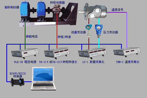- 系統(tǒng)通過1臺相位差式轉(zhuǎn)矩轉(zhuǎn)速傳感器及1臺TR-1C轉(zhuǎn)矩轉(zhuǎn)速采集儀(或TR-1D轉(zhuǎn)矩轉(zhuǎn)速采集儀)采集馬達(dá)的輸出轉(zhuǎn)矩和轉(zhuǎn)速;用1臺LY-1型數(shù)據(jù)采集儀采集流量和壓力;用1臺TEM-2溫度采集儀檢測溫升;用WLK-3B程控電源控制磁粉制動器對馬達(dá)進行加載。